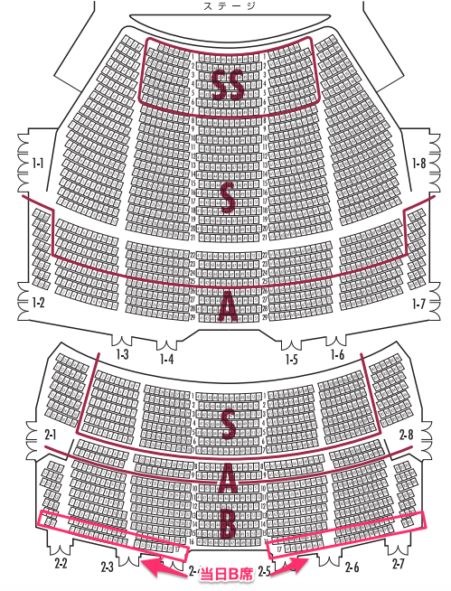 基本的には、当日券は「当日B席(2階席17列目)」と立ち見券の販売になりますが、前売り券がキャンセル等で残っている場合はSS席、S席、A席、B席も購入可能です。早くから当日券の列に並んでいれば、運が良ければ良席に巡り会えるチャンスもあります!