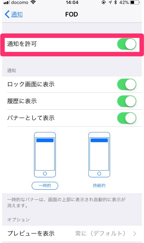 必ず設定の部分でFODアプリの通知をONにする必要があるので