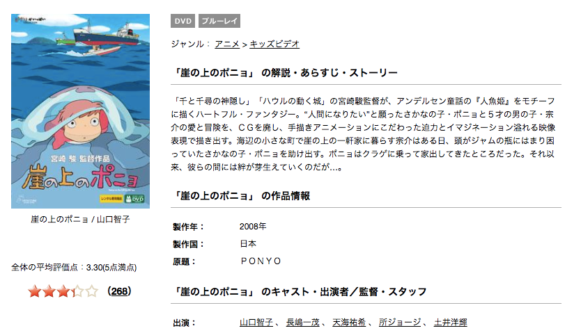 元がTSUTAYAなのでFODやHuluなどのテレビ局の縛りがなく配信されているからこそ、他社に比べてさまざまな作品を一気に見ることが出来ます崖の上のポニョ