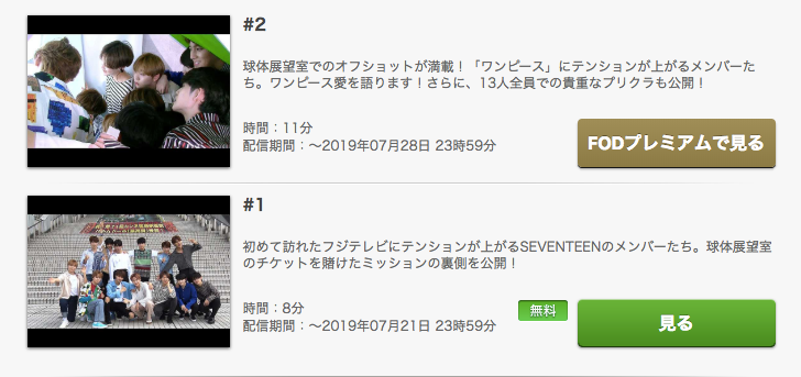 初めて訪れたフジテレビに大興奮するメンバーの様子や、お昼ごはんを賭けたチーム対抗ガチバトルなど、素顔のSEVENTEENが見れるのはFODだけ!彼らの魅力に迫るフル動画をぜひ見たいですよね!