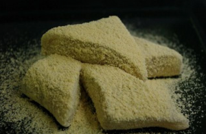 ふわっとした柔らかい生地にきな粉がまぶしてあるわらび餅風の生菓子。夕方には売り切れることも多いので気になる方はお早めに!